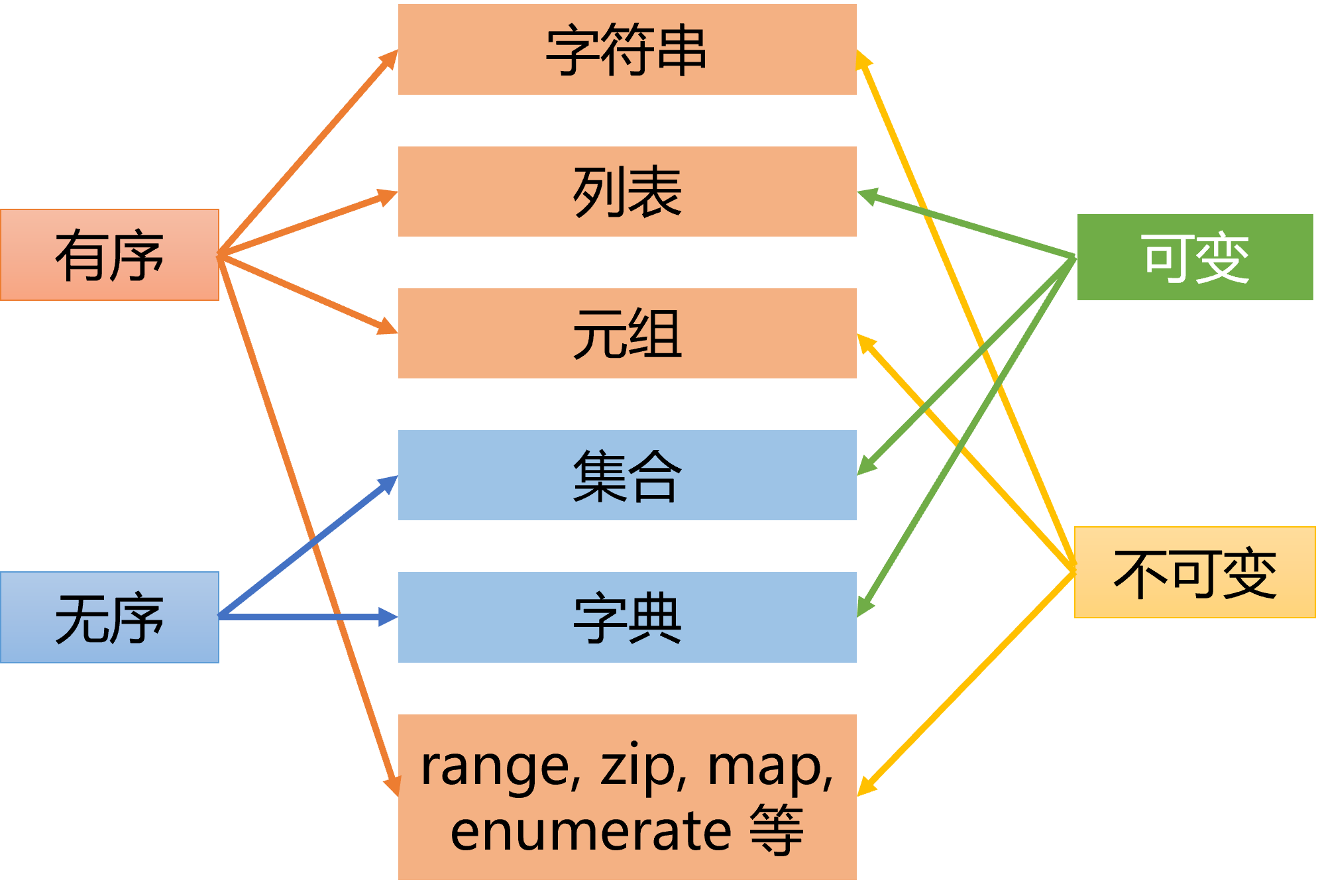 在这些数据结构中,字符串、列表、元组以及 range、zip、map 和 enumerate 等这些有序类型又都属于序列类型。其中列表、元组、range 对象为三种基本的序列类型。