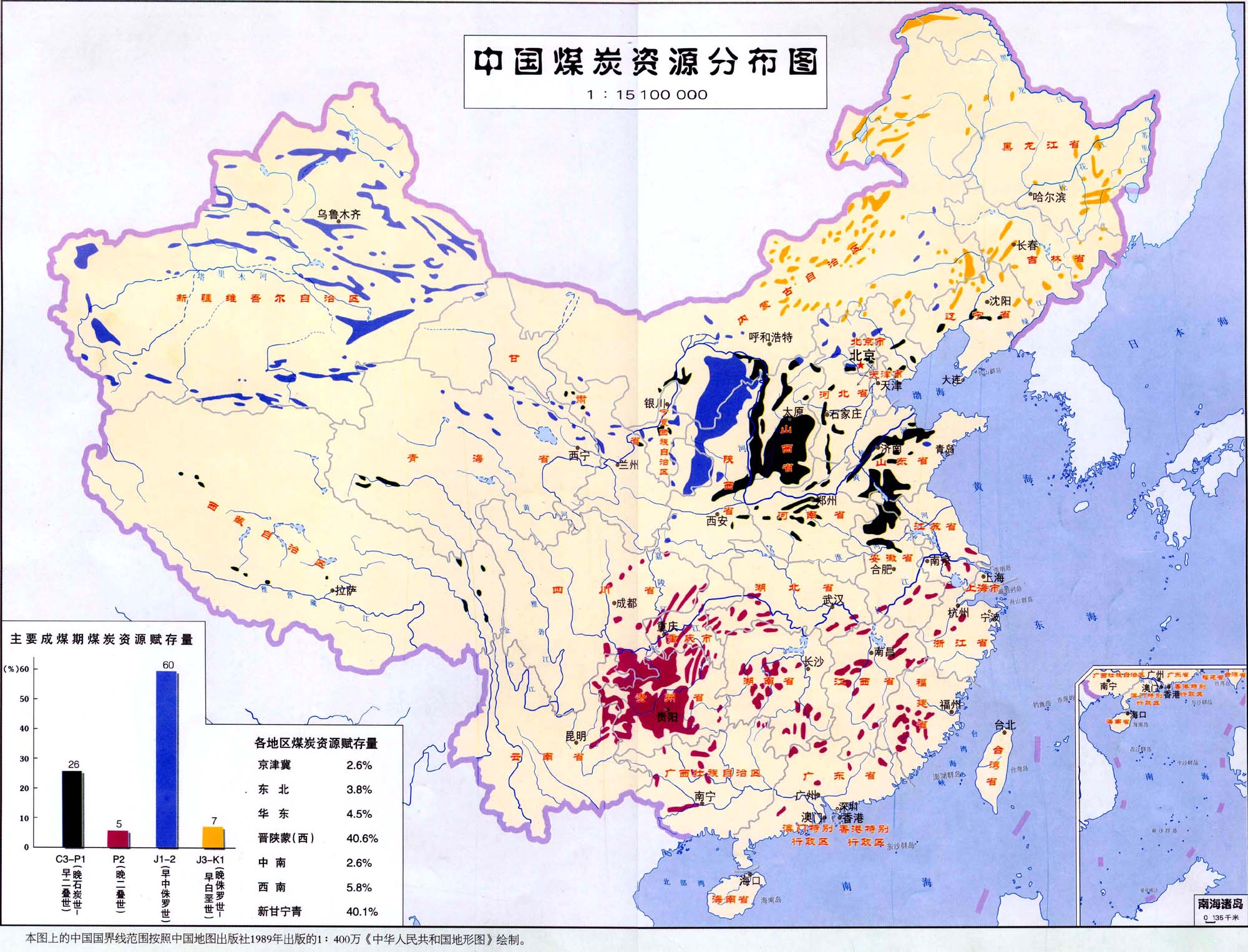 中国煤炭资源以石炭二叠纪及侏罗纪煤为主, 形成北方太行山——贺兰山之间包括晋、陕、蒙、宁、豫和新疆塔里木河以北, 以及南方川南、黔西、滇东富煤区; 但煤类分布极不平衡。