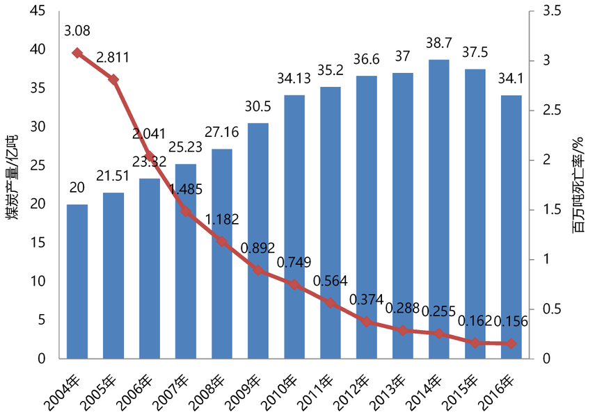 从2000年到2009年十年间,我国煤矿的百万吨死亡率总计为2.48,同期美国为0.0282,2016年我国煤矿的百万吨死亡率下降至0.156。