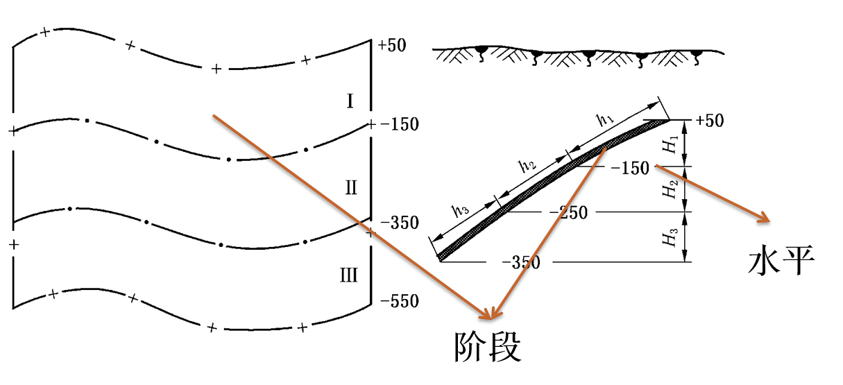 一般用水平面作为阶段上、下边界,叫水平。水平位置用标高来表示,如 +50m 水平、-150m水平等。布置有井底车场和主要运输大巷,并担负该水平开采范围内的主要运输和提升任务的水平称作开采水平。