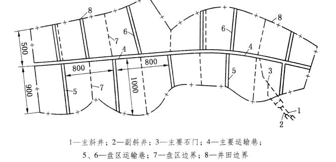 当煤层倾角较小,甚至接近水平时,没有必要再按照标高划分阶段。这时,沿煤层主要延展方向布置主要大巷,将井田分为两翼,然后以大巷为轴将两翼分成若干适宜开采的块段,每个块段叫一个盘区。每个盘区通过盘区石门与主要大巷相连,构成相对独立的生产系统。