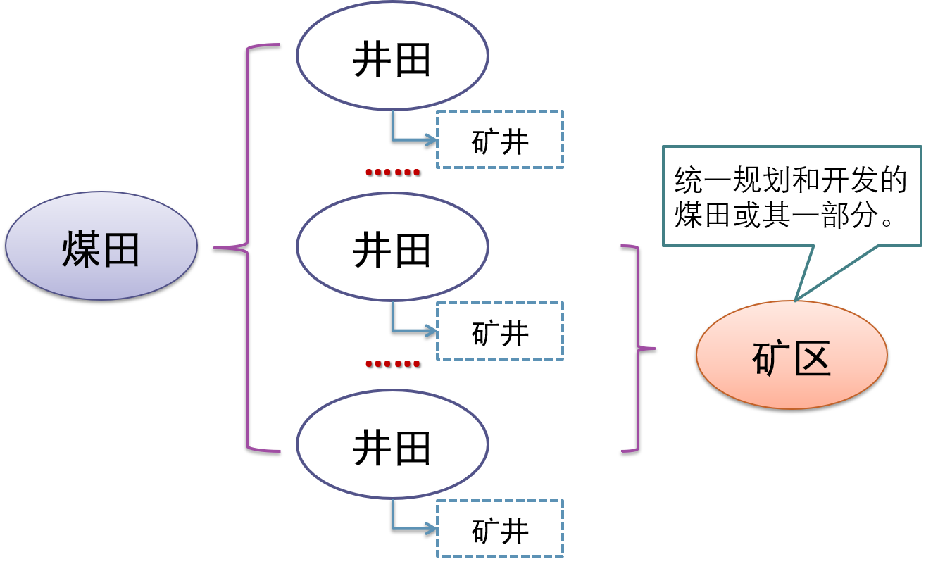 - 由于行政或经济上的原因,往往将临近几个井田划归为一个行政机构管理,而将这临近的井田合起来称为矿区。