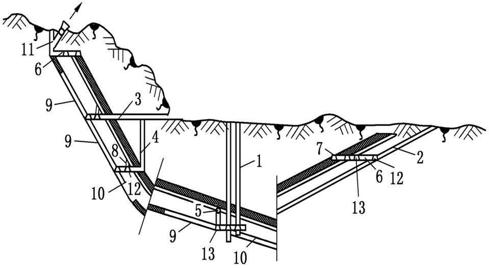 8-煤仓;9-上山;10-下山;11-风井;12-岩石平巷;13-煤层平巷