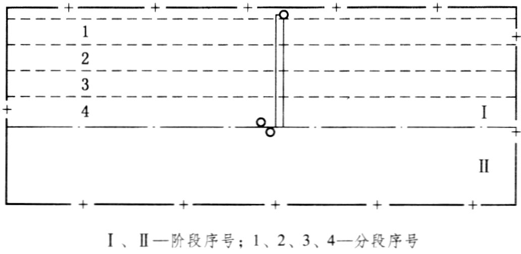 对于走向长度较小的井田,将整个阶段看作一个采区,沿走向方向不再划分,而是沿倾斜方向划分为若干分段,每个分段(相当于采区内的区段)内布置工作面。分段走向长度等于阶段走向长度。整个阶段布置一套上(下)山,回采巷道布置同采区式的区段平巷。