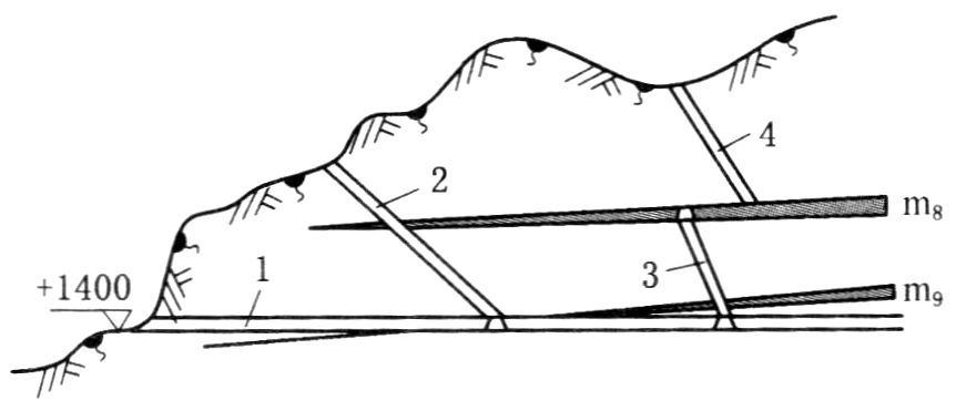 1-主平硐;2-副斜井;3-阶段运输大巷;4-阶段辅巷