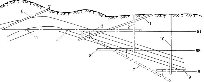 8-第二水平运输大巷;9-第三水平运输大巷;10-第三水平副立井