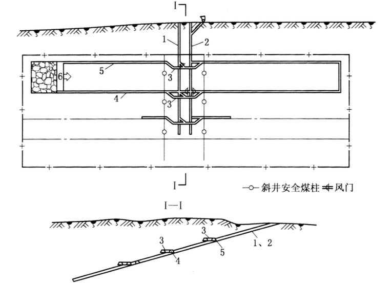 - 运煤路线:工作面6 ⇒ 阶段运输巷4 ⇒ 第一阶段下部车场3 ⇒ 主斜井1 ⇒ 地面