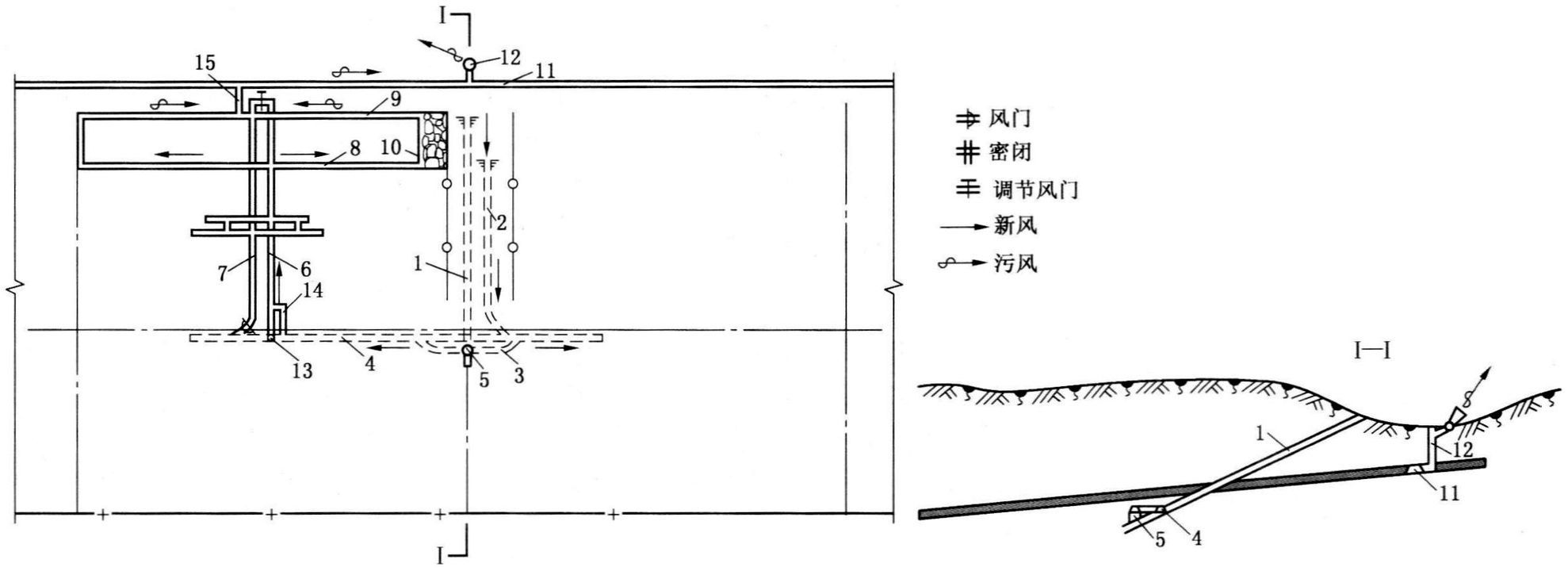 - 通风路线:地面新鲜风流 ⇒ 主、副斜井1、2 ⇒ 井底车场3 ⇒ 水平运输大巷4 ⇒ 行人进风斜巷14 ⇒ 采区运输上山6 ⇒ 区段运输平巷8 ⇒ 采煤工作面10(变为乏风) ⇒ 区段回风平巷9 ⇒ 采区回风石门15 ⇒ 水平回风大巷11 ⇒ 回风井12 ⇒ 地面