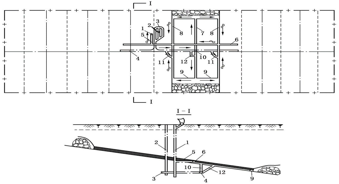 - 通风路线:地面新鲜风流 ⇒ 副井2 ⇒ 井底车场3 ⇒ 运输大巷4 ⇒ 行人进风斜巷12 ⇒ 分带运输巷7 ⇒ 工作面9(变为乏风) ⇒ 分带回风巷8 ⇒ 回风大巷6 ⇒ 回风石门5 ⇒ 主井1 ⇒ 地面