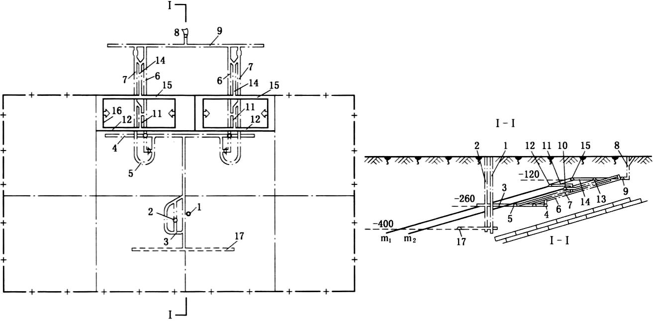 1-主井;2-副井;3-井底车场;4-运输大巷;5-下部车场;6-运输上山;7-轨道上山;8-回风井;9-总回风巷;10-m2区段运输平巷;11-区段运输石门;12-m1区段运输平巷;13-m2区段回风平巷;14-回风石门;15-m1区段回风平巷;16-工作面;17-400m水平运输大巷