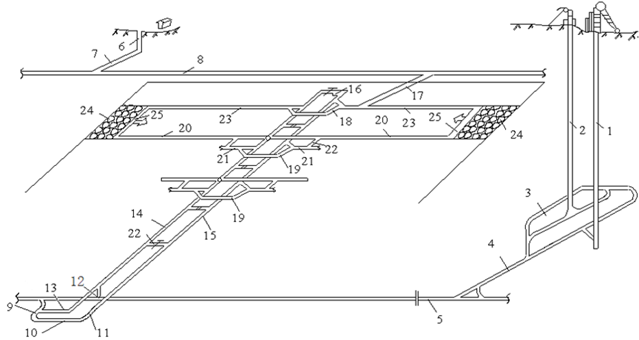 1-主井;2-副井,3-井底车场;4-主要运输石门;5-阶段运输大巷; 6-回风井;7-回风石门;8-回风大巷;9-采区运输石门;10-采区下部车场底板绕道;11-采区下部车场;12-采区煤仓;13-行人进风巷;14-运输上山;15-轨道上山;16-上山绞车房;17-采区回风石门;18-采区上部车场;19-采区中部车场;20-区段运输平巷;21-下区段回风平巷;22-联络巷;23-区段回风平巷;24-开切眼;25-采煤工作面