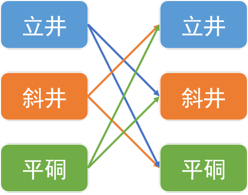 工程应用中,常把上述几种矿井开拓分类方式综合或部分综合进行描述。以立井为例,可以有: