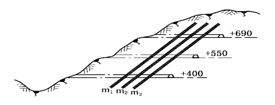 见下页图所示。该井田有两层可采煤层m1和m2,两层煤间距不大,采用联合开采的方式,在m2煤层底板岩石中布置阶段运输大巷和回风大巷,为两层煤所共用。井田内设两个开采水平。