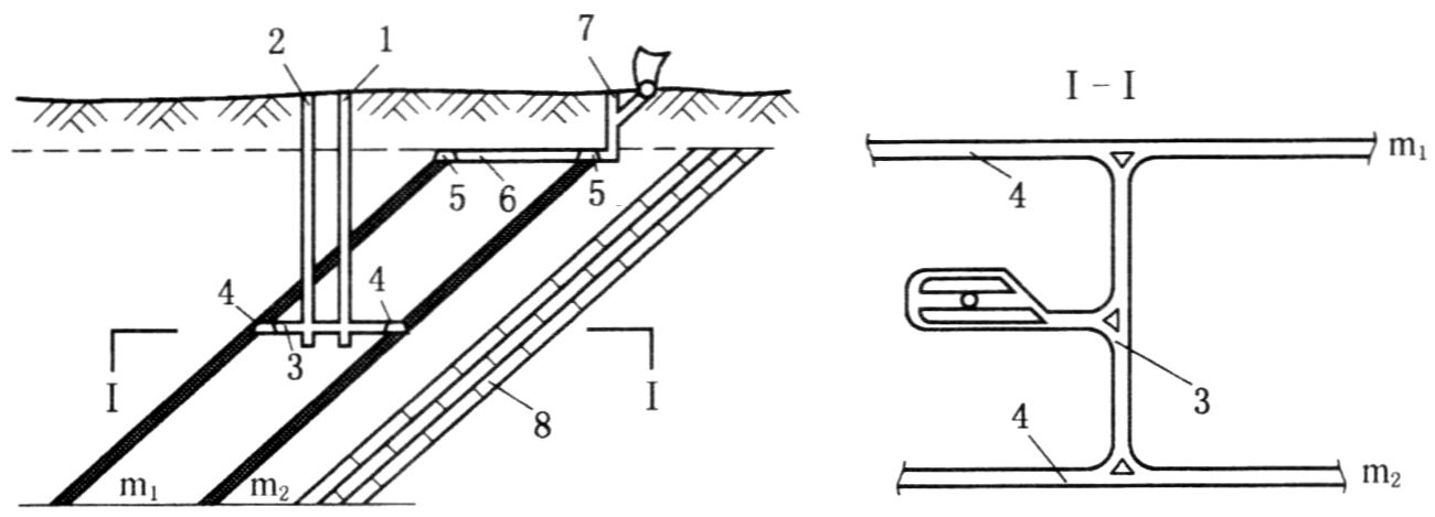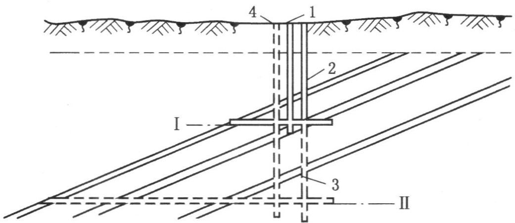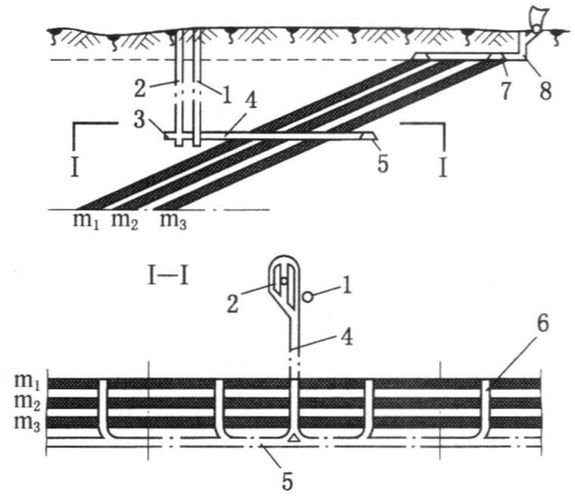 1-主井;2-副井;3-主要石门;4-分层运输大巷;