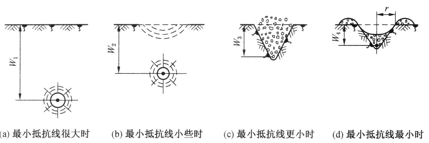 当最小抵抗线最小时(图8-8d的W4),炸药爆炸的能量不但破碎了岩石,而且足以推使岩石离开漏斗坑飞向四周,形成抛掷漏斗。