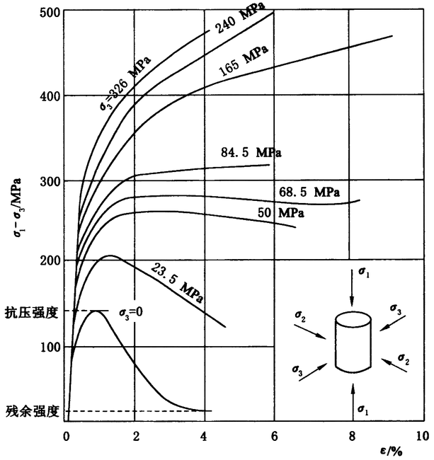 在自然环境条件下,岩体绝大多数处于三向压缩状态,研究岩石在三向压缩下的变形特性更有实际意义。岩石在三轴压缩条件下,随着围压等增加,其变形特征如下: