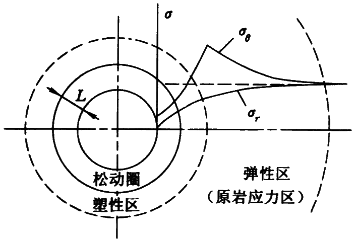 巷道开挖后会在围岩中形成一个破裂带,称为松动圈 。可按照松动圈的大小对围岩进行综合分级,这种方法是地应力和围岩强度的综合反映。松动圈越大,围岩收敛变形量越大,支护越困难。