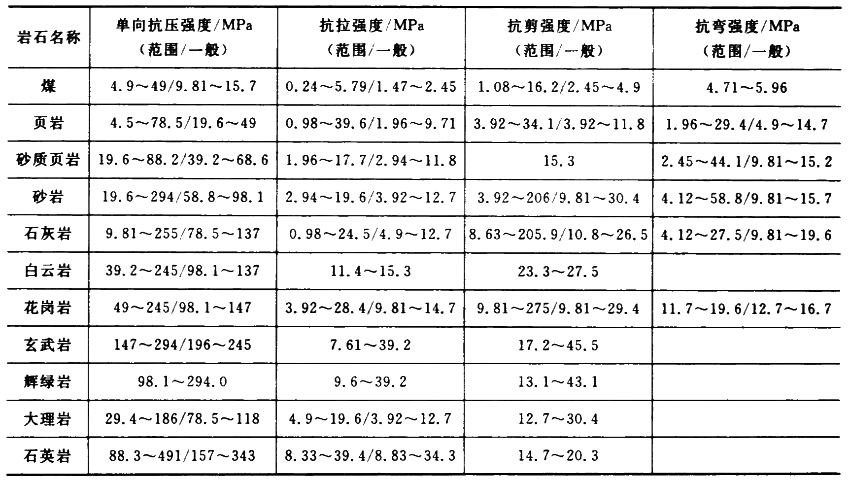 在不同受力状态下,岩石的极限强度相差悬殊。岩石强度的大小关系为:三轴等压抗压 > 三轴不等压抗压 > 双向抗压 > 单轴抗压 > 抗剪 > 抗弯 > 抗拉 。岩石的单轴抗拉强度一般为单轴抗压强度的1/10左右。