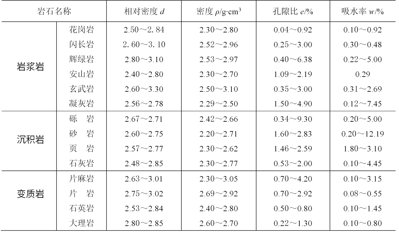 某些岩石的相对密度、密度、孔隙比和吸水率指标