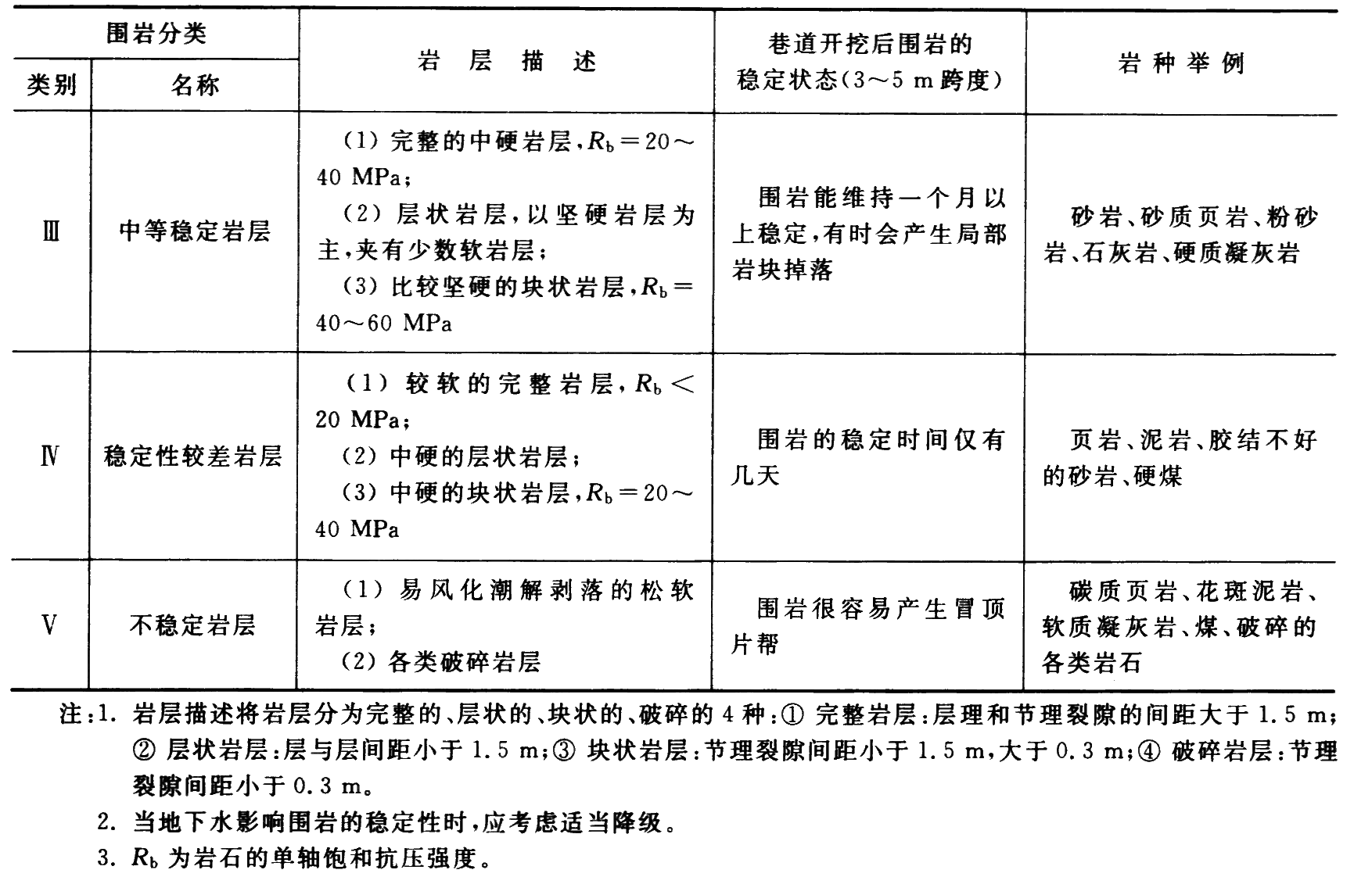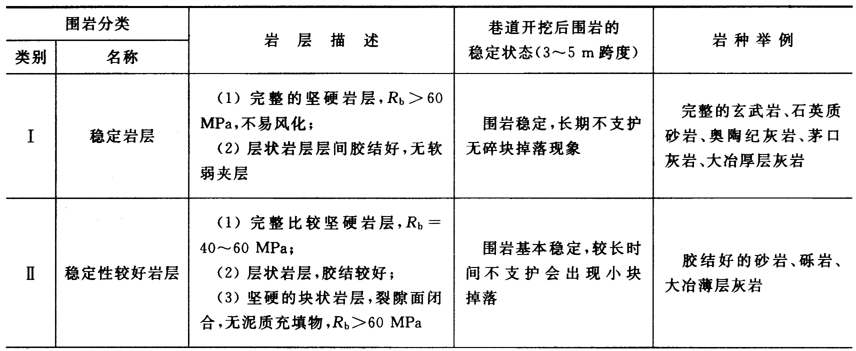 1988年,原煤炭工业部根据全国 58 条试验巷道的地质特征、井巷开挖后围岩的稳定状态,将围岩共分为 5 类,见下页表。