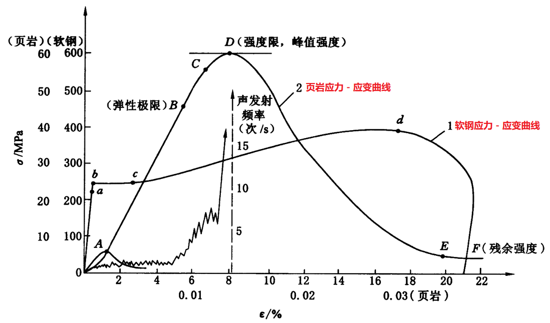 页岩全应力-应变曲线与软钢应力-应变全程曲线