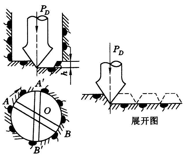 钻头在冲击力 Pd 的作用下,侵入岩石并形成一条凿痕 AB,随后钻头转动一个角度并再次冲击,在岩石上形成另一条凿痕 A'B',两个凿痕之间的岩石(扇形 AOA' 和 BOB')也将同时被剪切掉。如此反复。利用压风或水流将破碎后的岩屑排出孔外。