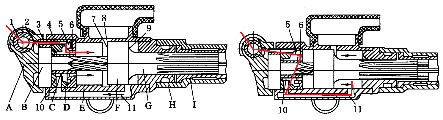 1—操纵阀孔道;2—柄体气室;3—棘轮孔道;4—阀柜孔道;5—阀柜前气室;