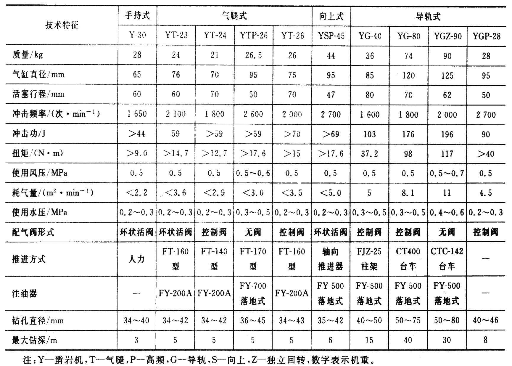 风动凿岩机是以压缩空气为动力的钻孔机具。按其支架方式可分为手持式、气腿式、向上式(伸缩式)和导轨式四种。按冲击频率分可分为低频(小于2000次/min)、中频(2000~2500次/min)和高频(大于2500次/min,较少见)的三种。