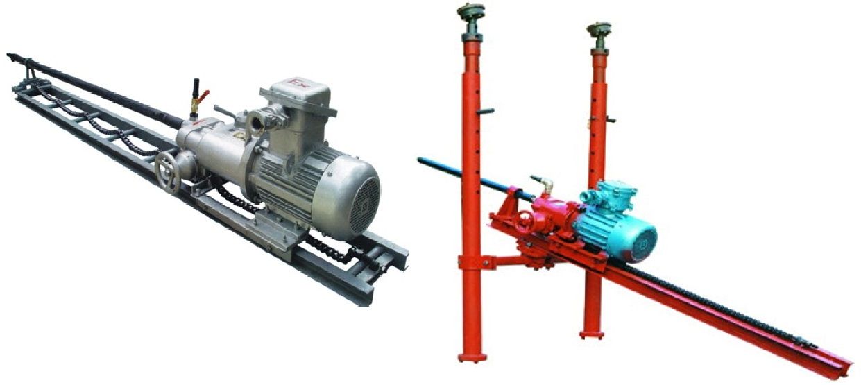 岩石电钻的构造与煤电钻基本相同,可在中等硬度(f = 4~8)岩石中钻眼。与冲击式凿岩机相比,由于直接利用电能,能量利用效率高,设备简单,以切削方式破岩,钻速高,噪声低。岩石电钻装设有推进机械,以便对钻头施加较大的轴推力。岩石电钻的破岩效率与钻速高的优点,只有在钎杆能承受较大扭矩,钎刃耐磨,钎头寿命长的情况下才能实现。