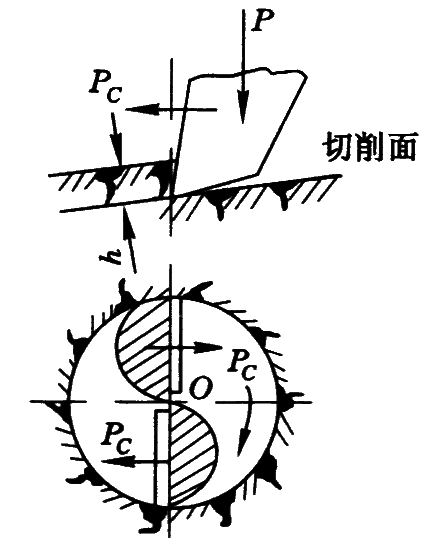 切割型钻头在轴压力P的作用下,克服岩石的抗压强度并侵入岩石一定深度 h;同时钻头在回转力 Pc 的作用下,克服岩石的抗切削强度,将岩石一层层切割下来,钻孔运行的轨迹是沿螺旋线下降,岩屑被排出孔外。