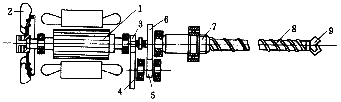 1—电动机;2—风扇;3~6—减速器齿轮;7—电钻心轴;8—麻花钻杆;9—钎头