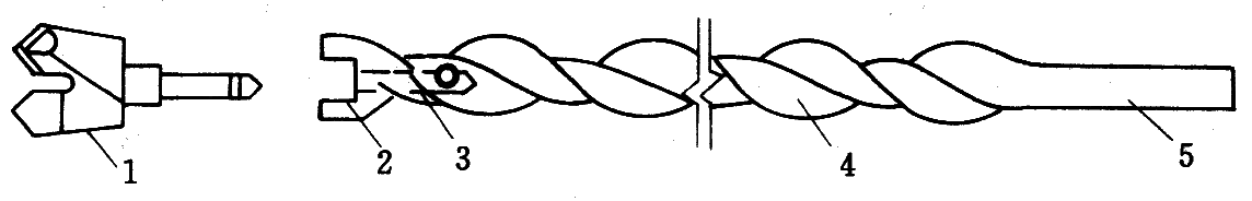煤电钻的钻具由钻头 1 和麻花钻杆 4 组成。钻杆前部的方槽 2 和尾孔 3 是用来插入钻头的,钻头插入后,从尾孔 3 上的小圆孔中插入销钉固定钻头。麻花钻杆尾部 5 车成圆柱形,用以插入电钻的套筒内。套筒前端有两条斜槽,可以卡紧在麻花螺纹上,以传送回转力矩。