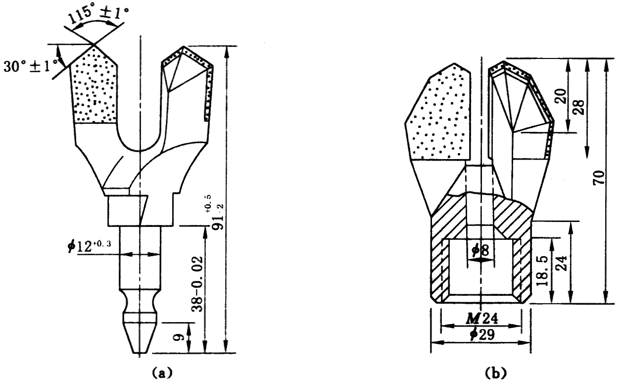 (a) 煤电钻钻头;(b) 两翼型岩石电钻钻头