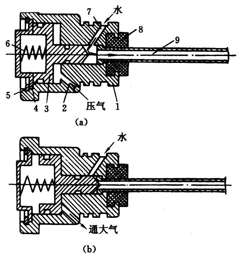 5—密封圈;6—弹簧;7—进水孔;8—密封胶圈;9—水针