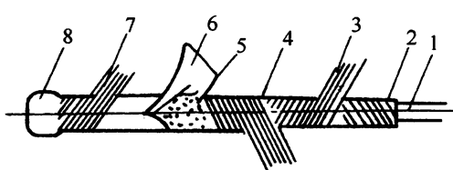 1—芯线;2—药芯;3—内层棉纱;4—中层棉纱;5—内防潮层(沥青层);6—纸条;7—外层棉纱;8—外防潮层