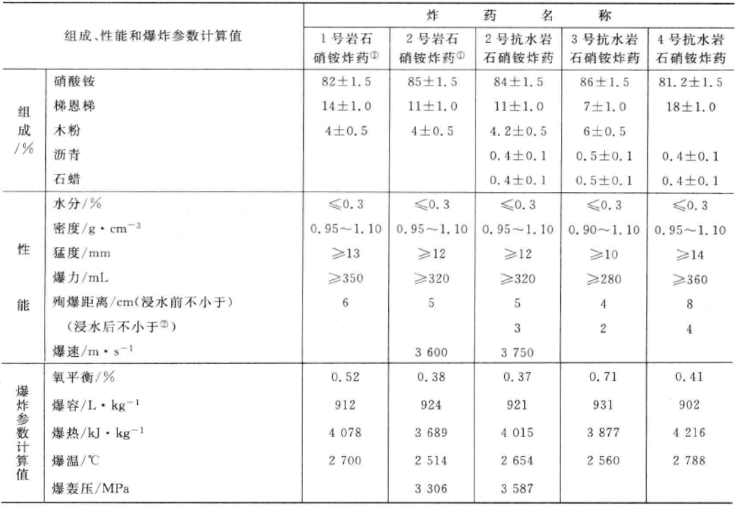 通用的硝铵炸药,性能稳定;防水性能一般。分为煤矿、岩石、露天三类。前两类可用于井下。其特点是氧平衡值接近于零、有毒气体产生量受严格限制。煤矿硝铵炸药是供有瓦斯或煤尘爆炸危险的矿井使用的炸药,必须检验它对瓦斯引爆的安全性。露天炸药以廉价为主,故硝酸铵含量较高,梯恩梯含量较低,木粉也多一些。各类铵梯类炸药又分1~4号,威力按4、1、2、3递减,号越大安全性越好。