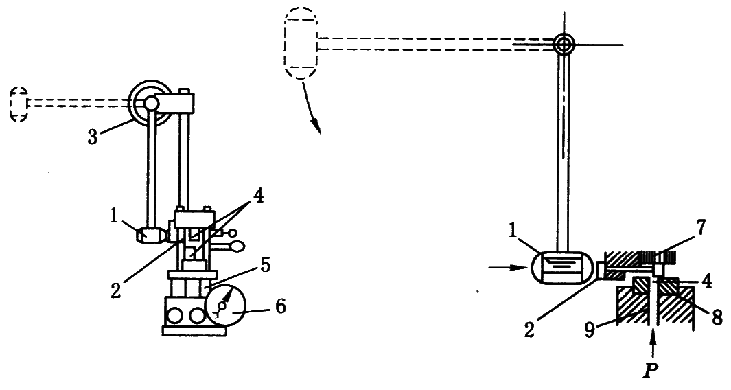 1—摆锤;2—击柱;3—角度表盘;4—测定装置(上下击柱);5—油压机;6—压力表;7—顶板;8—导向套;9—柱塞