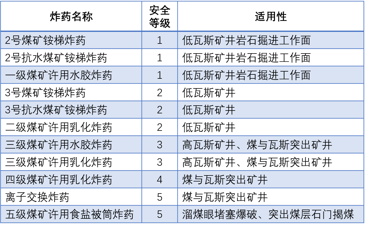 煤矿许用炸药分为5级,级别越高越安全。其中1、2级适用于低瓦斯矿井,3、4级适用于高瓦斯和煤和瓦斯突出矿井,5级用于溜煤眼爆破和过石门揭开瓦斯突出煤层。《煤矿安全规程》第三百五十条规定: