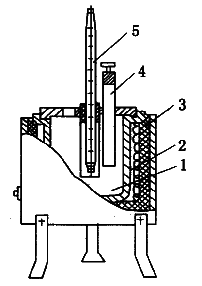 1—合金浴锅;2—电热丝;3—隔热层;4—铜试管;5—温度计