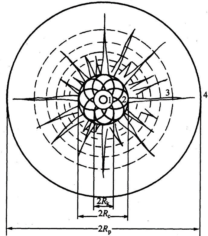 1—扩大的空腔;2—压碎区;3—破裂区;4—震动区