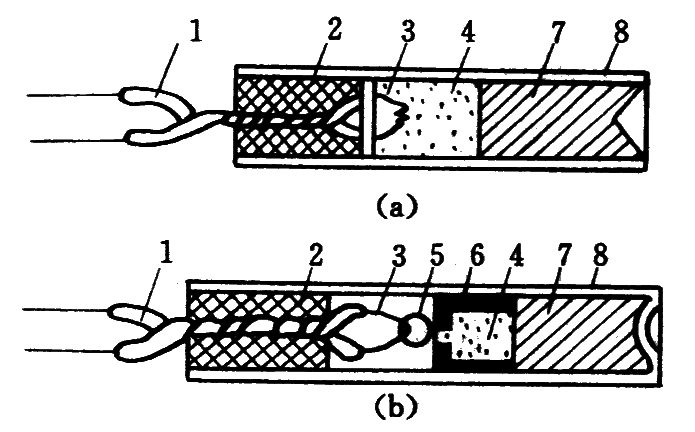 1—脚线;2—密封塞;3—桥丝;4—起爆药;5—引火药头;6—加强帽;7—加强药;8—管壳