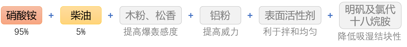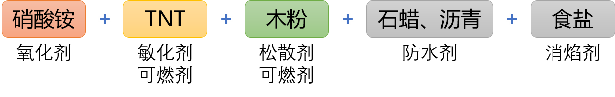 不含梯恩梯,原料来源丰富、加工简单、使用安全,其价格低廉,因此在露天矿、金属矿、水利、铁道等工程中使用较多。爆炸威力较低,比较钝感,易吸湿结块,贮存期短。