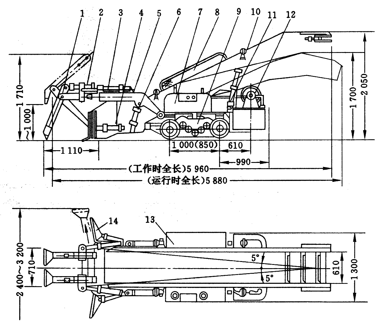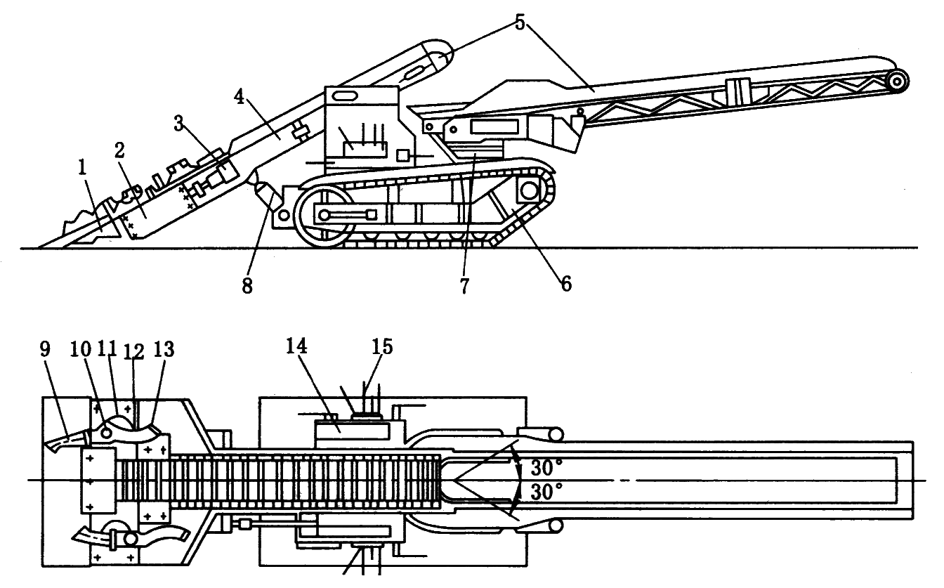 1—立爪;2—耙取油缸;3—回转油缸;4—集砟油缸;5—工作大臂;6—大臂油缸;7—液控箱;8—回转机构;9—行走底盘;10—刮板输送机;11—支撑油缸;12—油泵;13—电控箱;14—集砟门