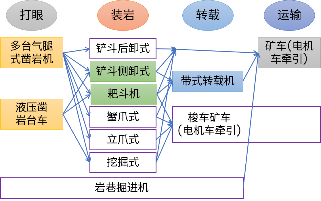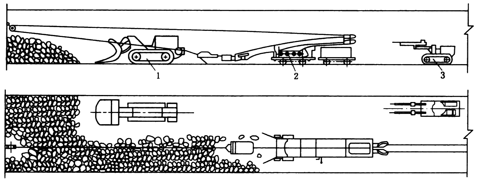 1—气腿式凿岩机;2—耙斗;3—装载机;4—转载机;5—重车;