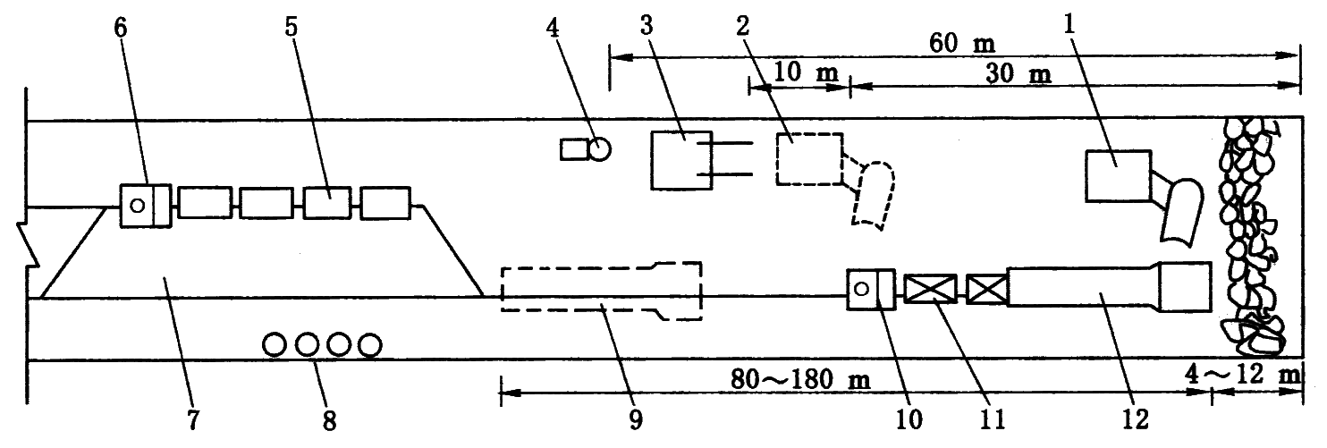1—侧卸式装载机;2—爆破时装载机的位置;3—液压凿岩台车;4—混凝土喷射机;5—空车;6,10—电机车;7—调车场;8—开关;9—爆破时转载机的位置;11—重车;12—胶带转载机