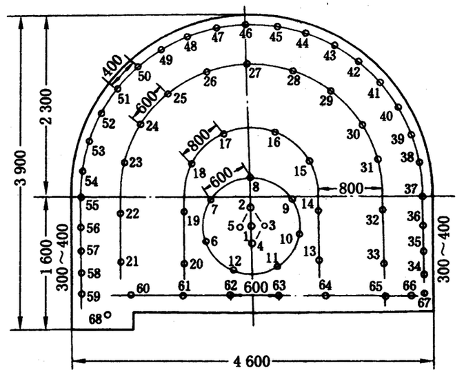 21~33—第三圈辅助眼;34~37,55~59—帮眼;38~54—采拱眼;60~67—底眼;68—水沟眼