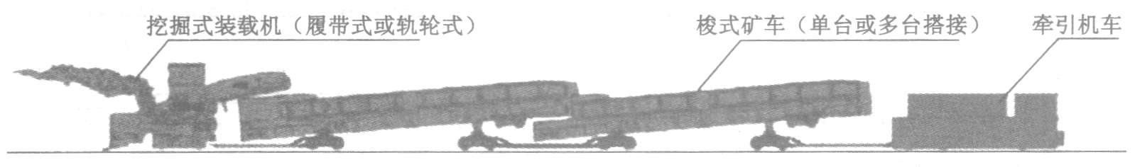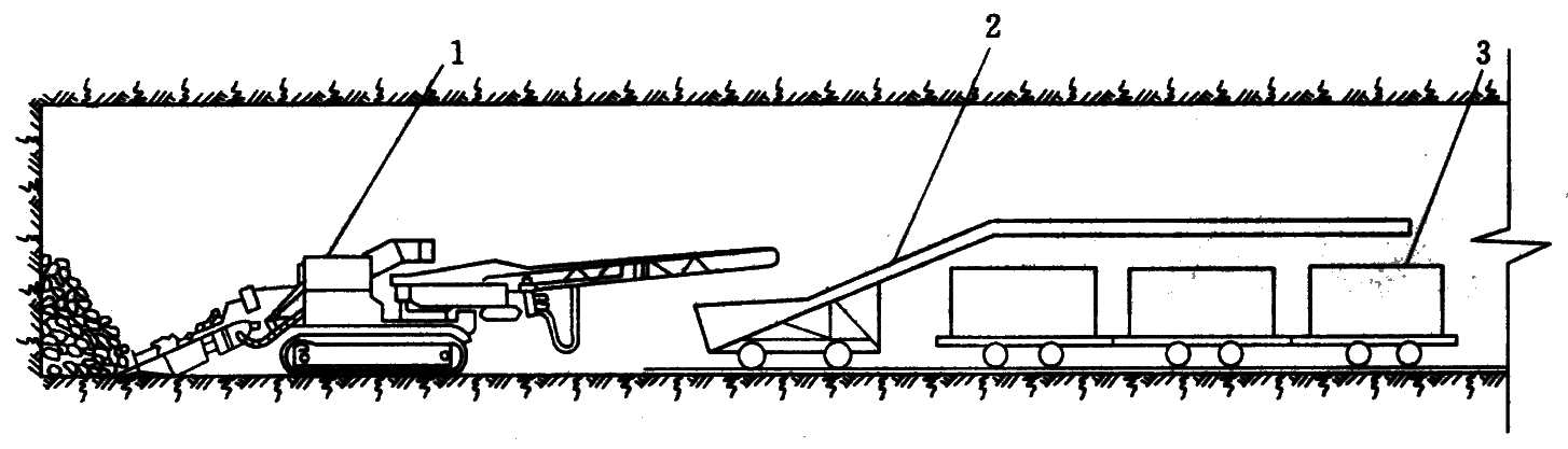 1—蟹爪式装载机;2—悬臂式胶带转载机;3—矿车