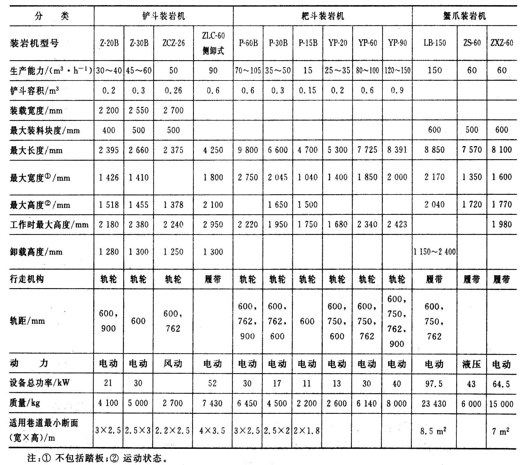 选择装载机主要应考虑巷道断面大小,装载机的适应性和可靠性,操作和维修的难易程度,装载机与其他设备的配套,以及装载机的造价和效率等因素,最后综合确定。目前使用较多的仍然是耙斗装载机,侧卸装载机次之,挖装机将会推广应用。实际可参照下页表进行选择。