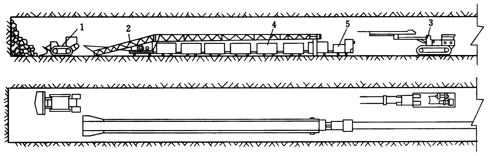 1—侧卸式装载机;2—转载机;3—凿岩台车;4—矿车组;5—电机车
