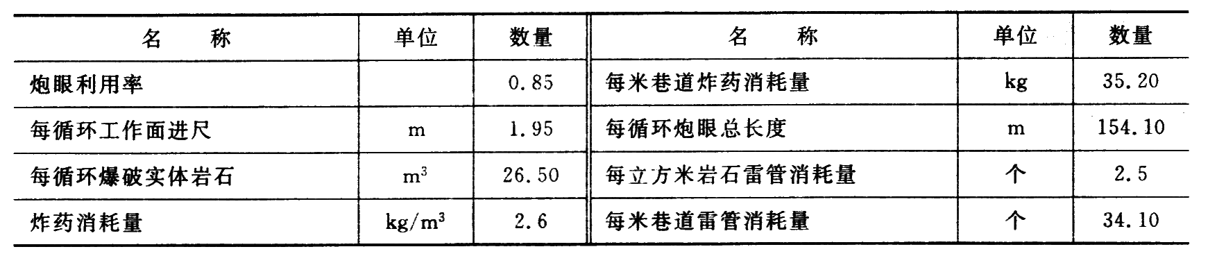 炸药消耗量是一个重要参数,它直接影响到岩石块度、钻眼和装岩的工作量、炮眼利用率、巷道轮廓、围岩稳定性以及爆破成本等。目前还没有精确计算炸药消耗量的方法,计算数一般仅作为参考,所以多按定额选用,见下页表。